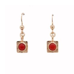 Boucles d'oreilles légèrement pendante en argent blanc 925 représentant deux fleurs, une petite et une grande marguerite chacune avec un cabochon rond en corail rouge de méditerranée.