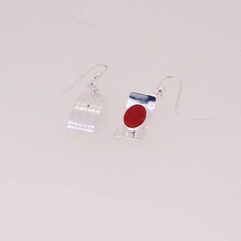 Boucles d'oreilles en argent 925/000, modèle pendant sur l'oreille représentant une pagode avec au centre un cabochon de corail rouge de Méditerranée.