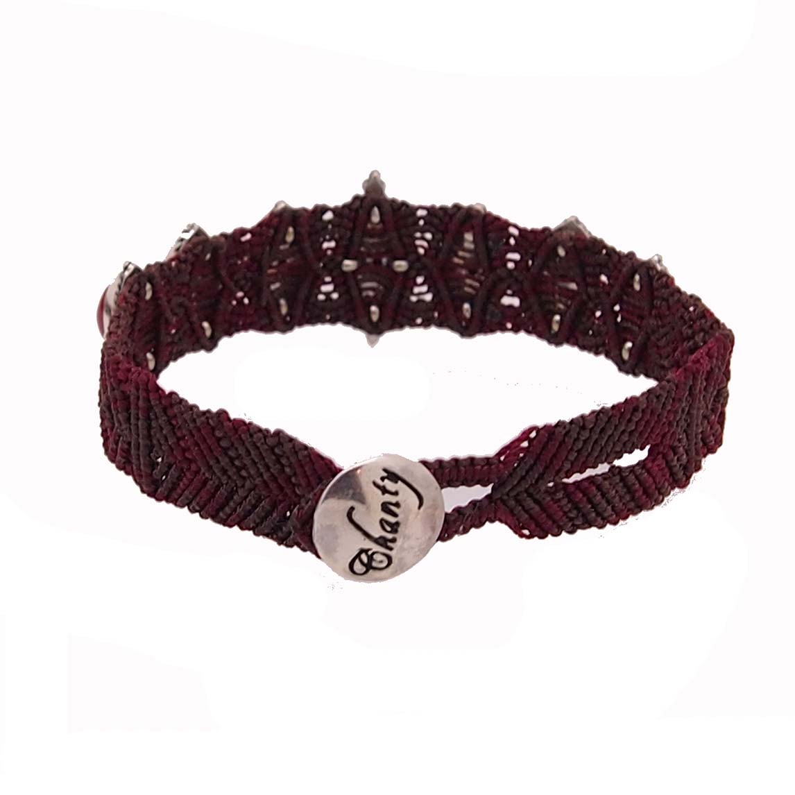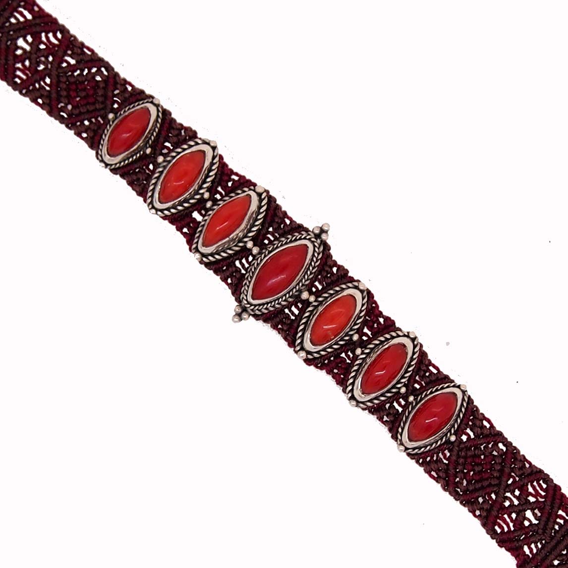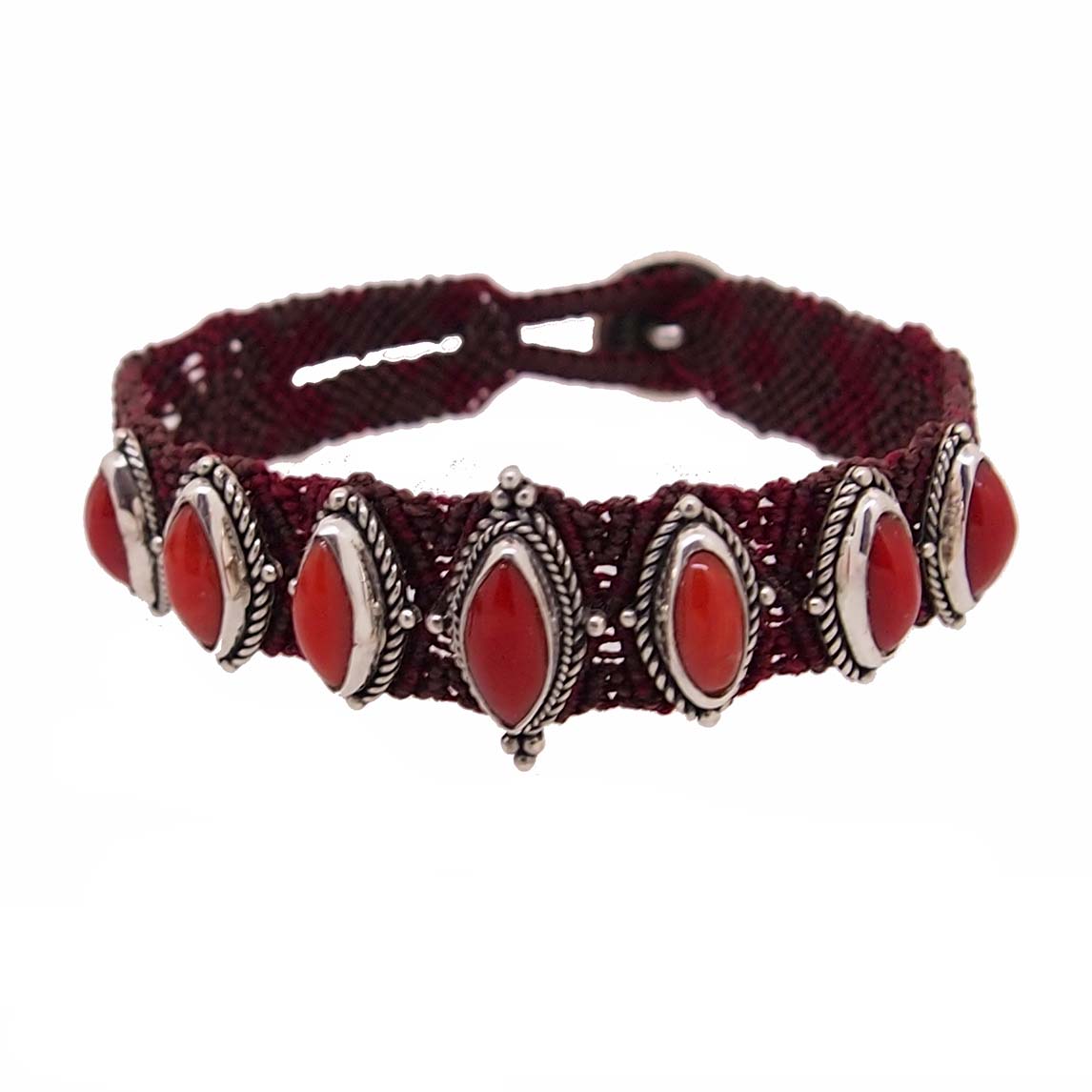 Ce bracelet tissé de fils rouges et bruns est composé de 7 navettes en corail rouge de Méditerranée serties sur des motifs argent. Un bouton en argent permet grâce à deux boutonnière de le fermer. Un réglage sur deux tailles est possible. Mélangeant les matières, ce bijou de la collection Bali est une création unique et exclusive. Nous confions notre corail à un atelier balinais qui réalise les bijoux dans la plus pure tradition. Une invitation au voyage !