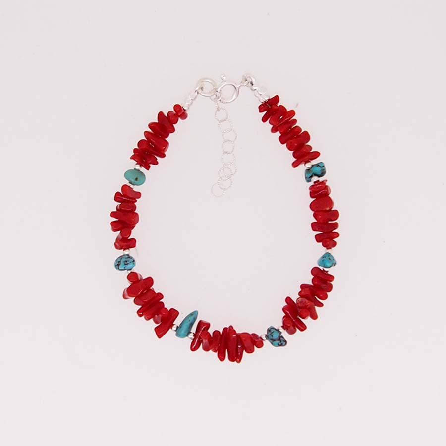 Bracelet pointe de corail rouge de Méditerranée et morceaux de turquoise. Le fermoir, les intercalaires et la chaînette d'allonge sont en argent 925/000.