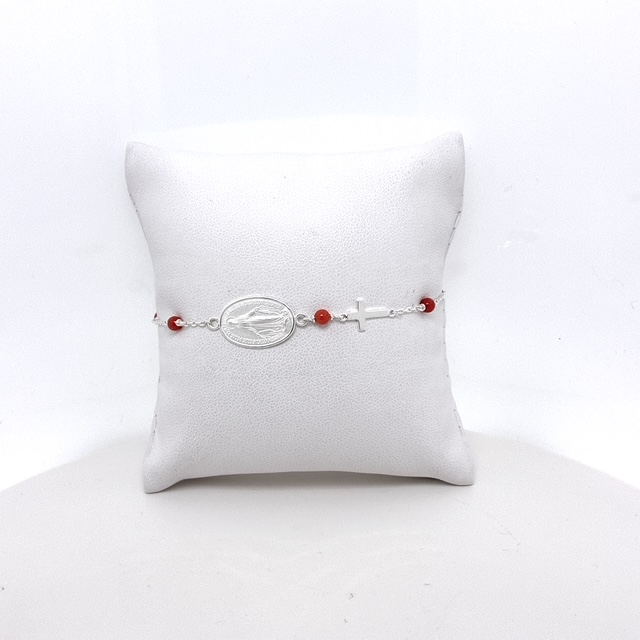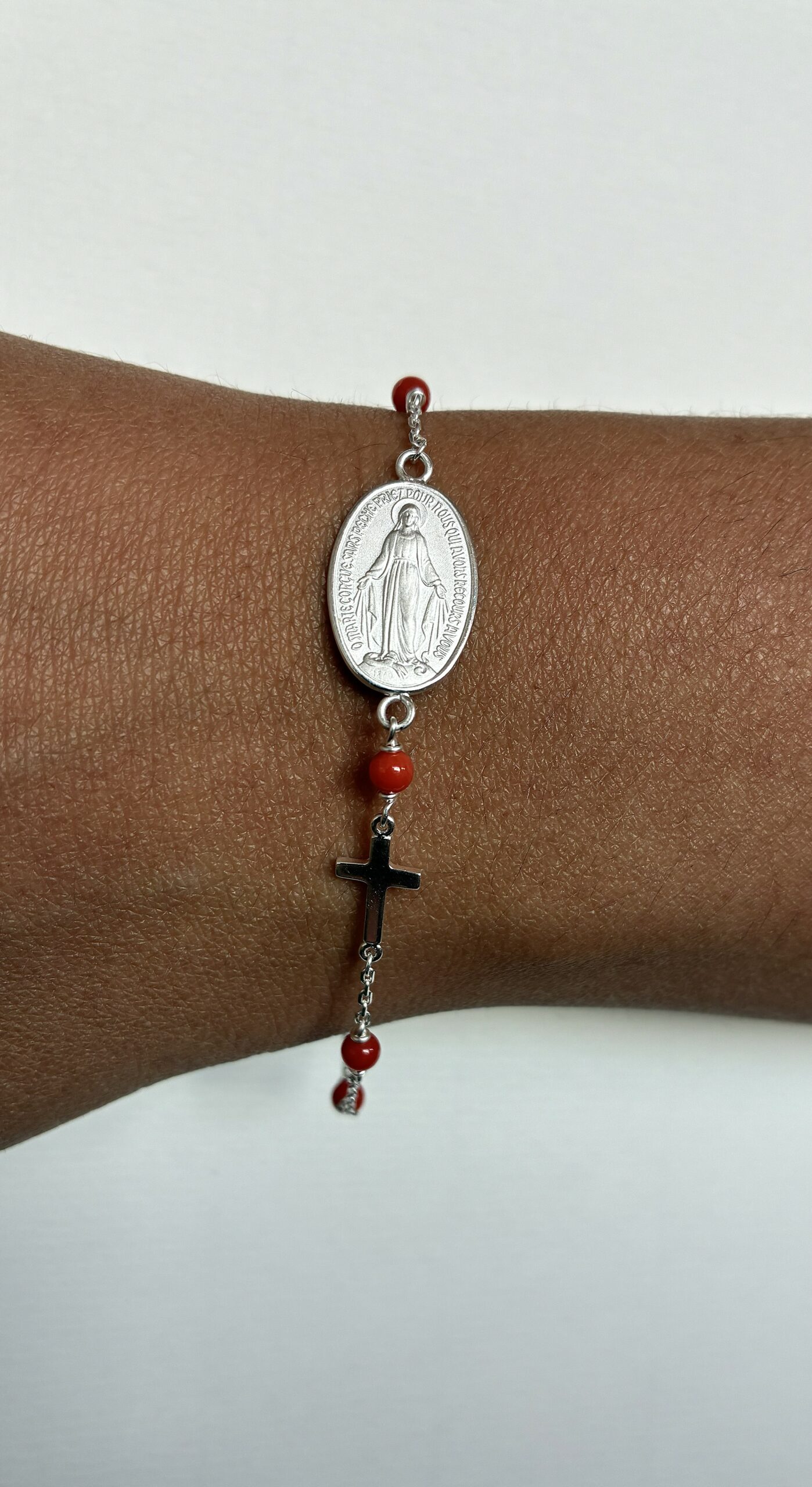 Au centre, une médaille de la Vierge Miraculeuse et une petite croix se mêlent à un Corail Rouge offrant à la fois charme et spiritualité à votre poignet.