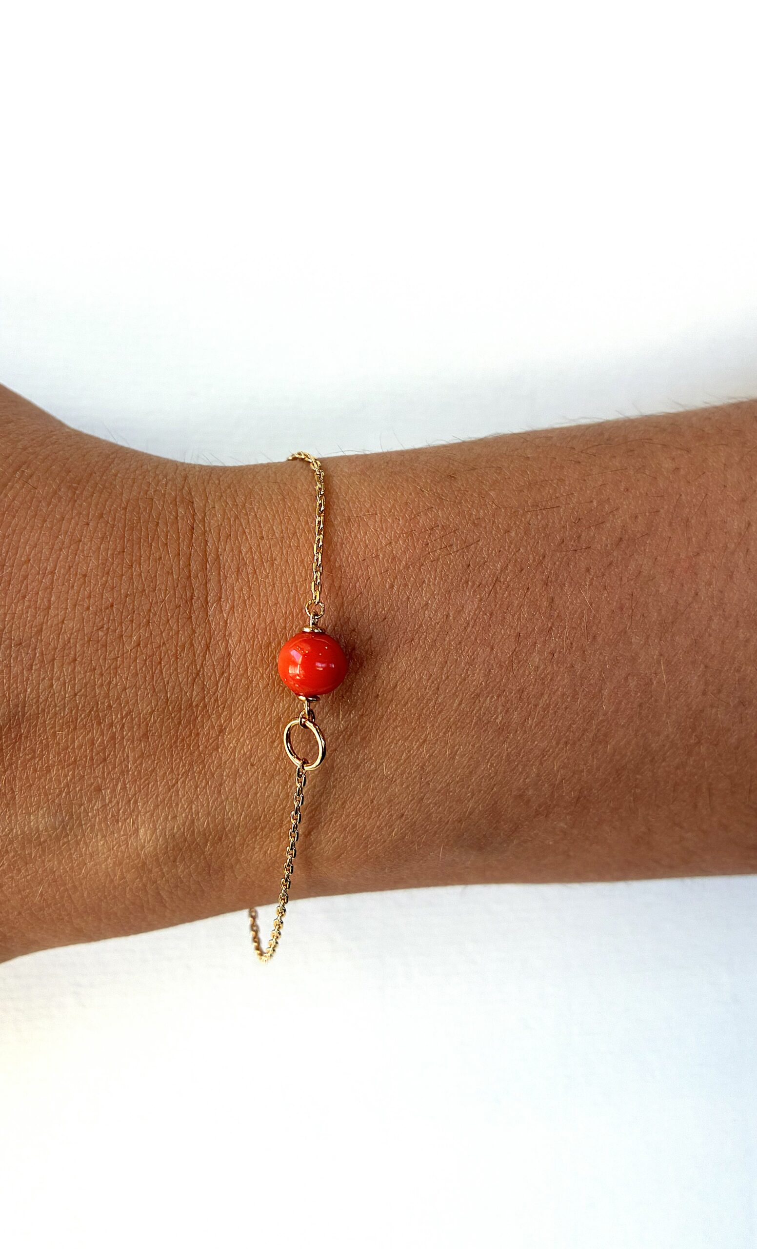 Ce bijou suspend avec finesse une perle de corail véritable au cœur d'un anneau délicat, créant un contraste lumineux.