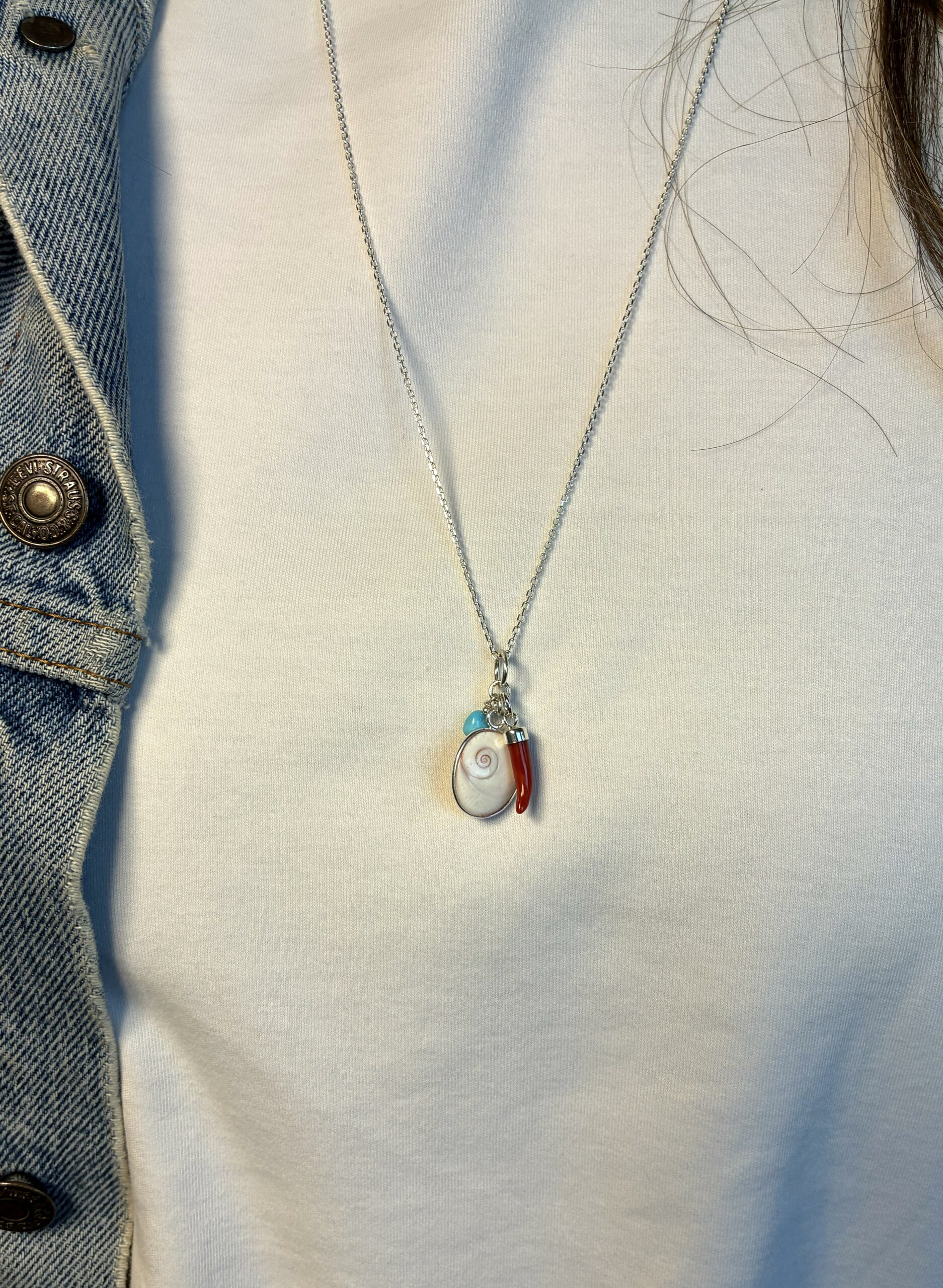 Le pendentif Trio est composé d'une petite turquoise, d'un petit œil de sainte Lucie et d'une petite corne en corail de Méditerranée.