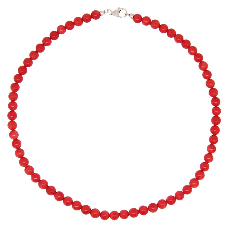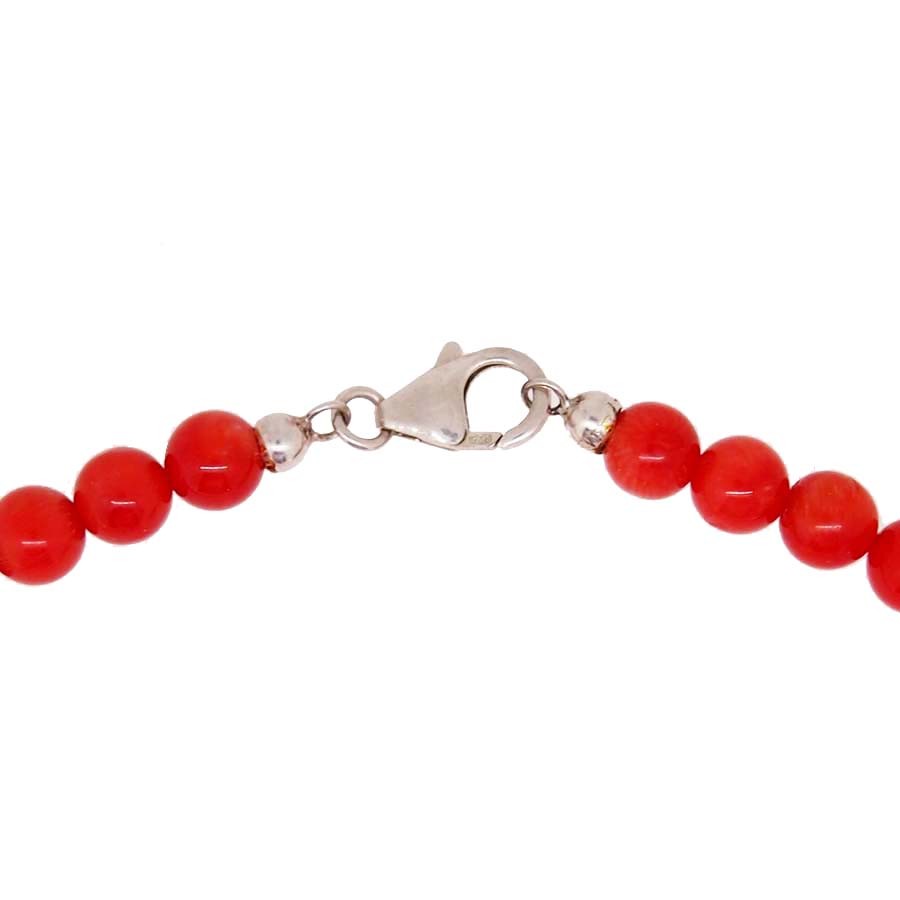 Ce collier boule en corail rouge de Méditerranée présente un fermoir mousqueton en argent monté sur fil. Simple et intemporel, ce bijou siéra parfaitement à un habit décolleté comme à un chemisier ou un pull à col rond.