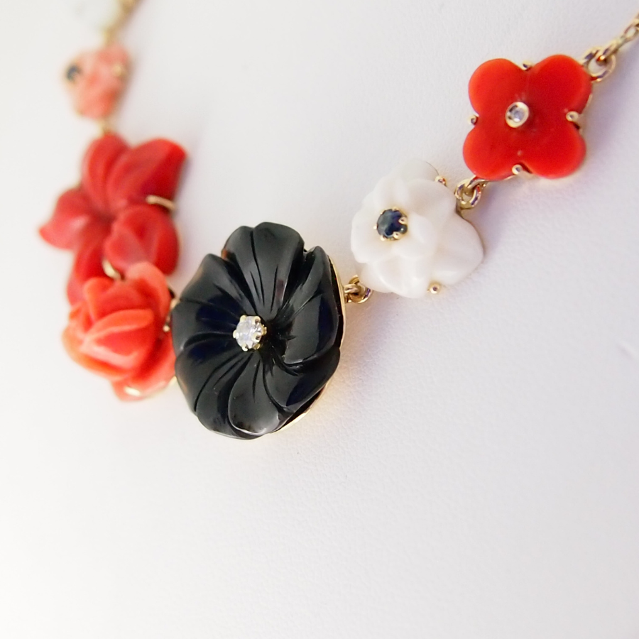 Beau dans sa simplicité, ce tour de cou se compose d'une farandole de fleurs sculptées dans du corail rouge de Corse et du corail rose du Japon, une grosse fleur de marbre noir, ainsi que deux trèfles composés de corail de méditerranée et nacre . Cette ribambelle de couleurs pastels apporte beaucoup de douceur et une élégance subtile à cette cascade fleurie. Les pistil de chaque fleur est représenté par des diamants et saphirs (la tige griffée ou cerclée permet de maintenir le motif à sa plaque d'or 18k).