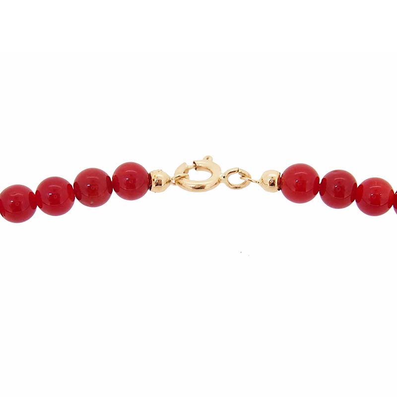 L’indémodable collier en corail rouge de Méditerranée avec de petites perles de 5 millimètre de diamètre monté sur un fermoir anneau ressort or jaune 18k.