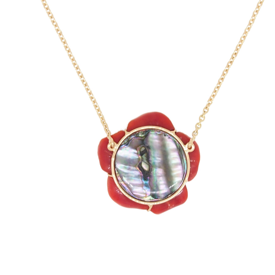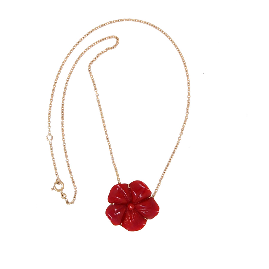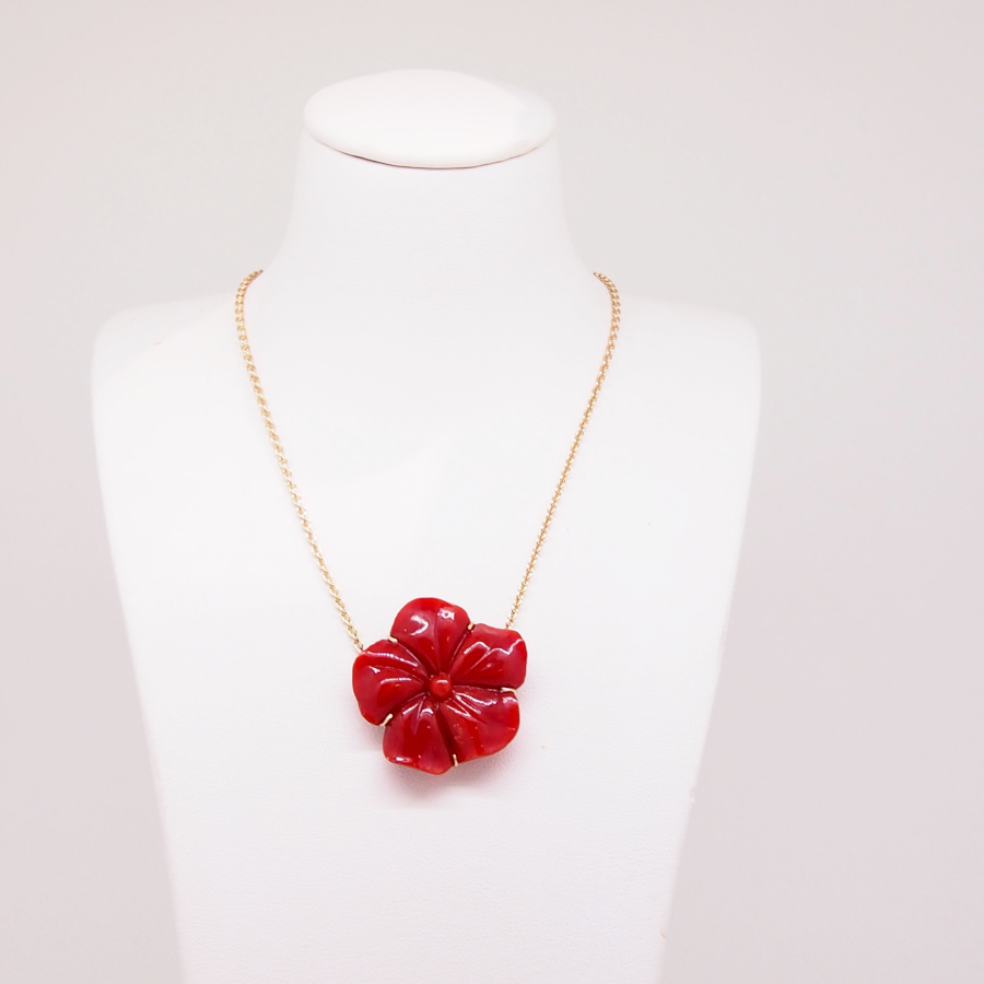 Délicat tour de cou en or jaune 18k qui porte une fleur de corail rouge de Méditerranée aux cinq pétales.