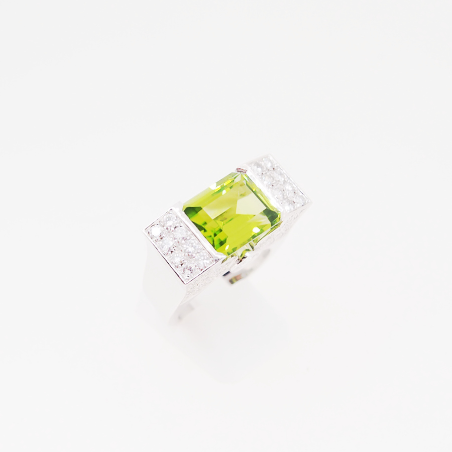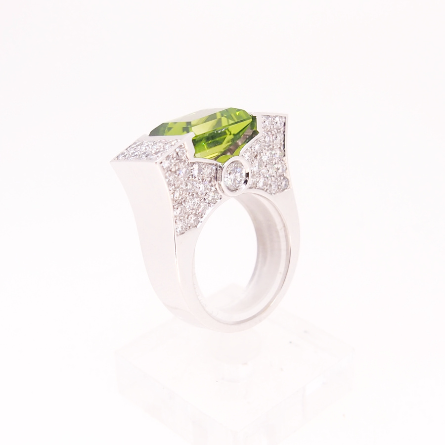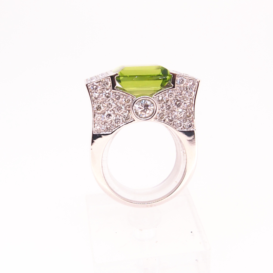 Le péridot taille émeraude se pose sur une monture sertie de diamants. La ligne de la monture en or blanc est moderne et franche. Sur la face avant et arrière, au centre du pavage un cercle d'or accueille un diamant rond. Ce détail vient rythmer l'ensemble.