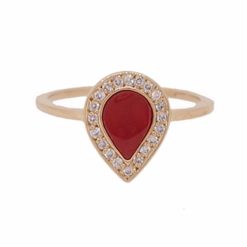 Bague goutte or jaune 18k, diamants et corail rouge.