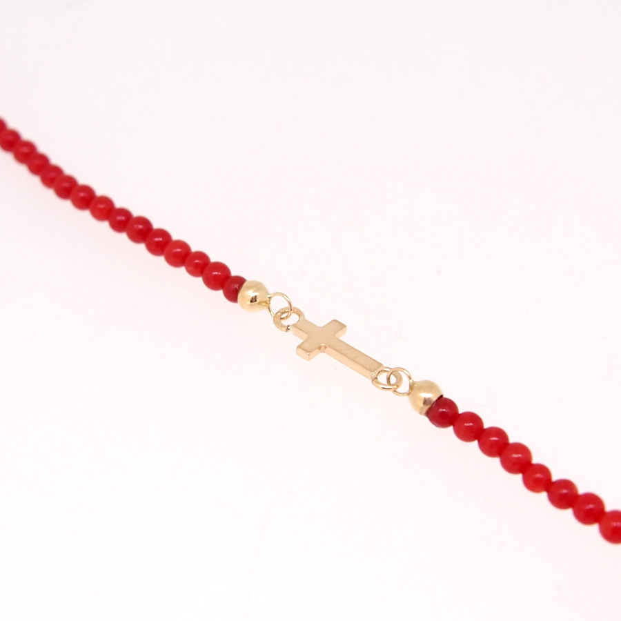 Ce bracelet en perles de corail de 2mm accueille en son centre une croix en or jaune 18k. Il s'agit d'un cadeau idéal pour marquer une cérémonie ou une célébration.